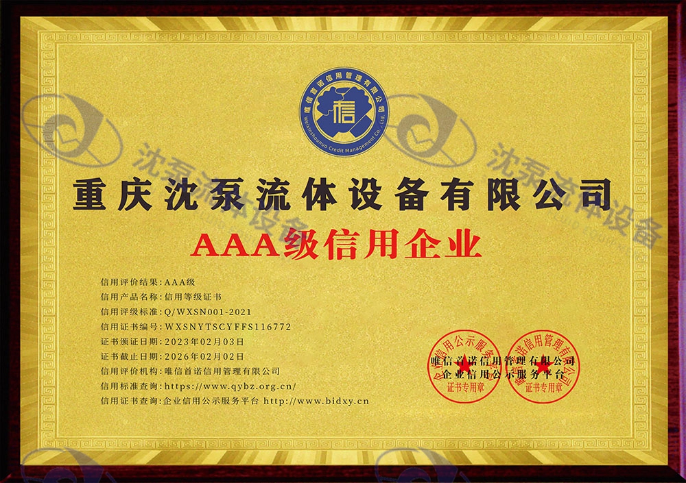 重慶沈泵流體設備有限公司_AAA級信用企業(yè)_牌匾